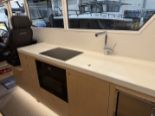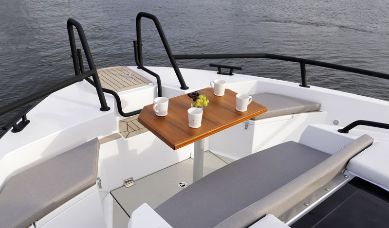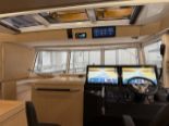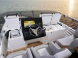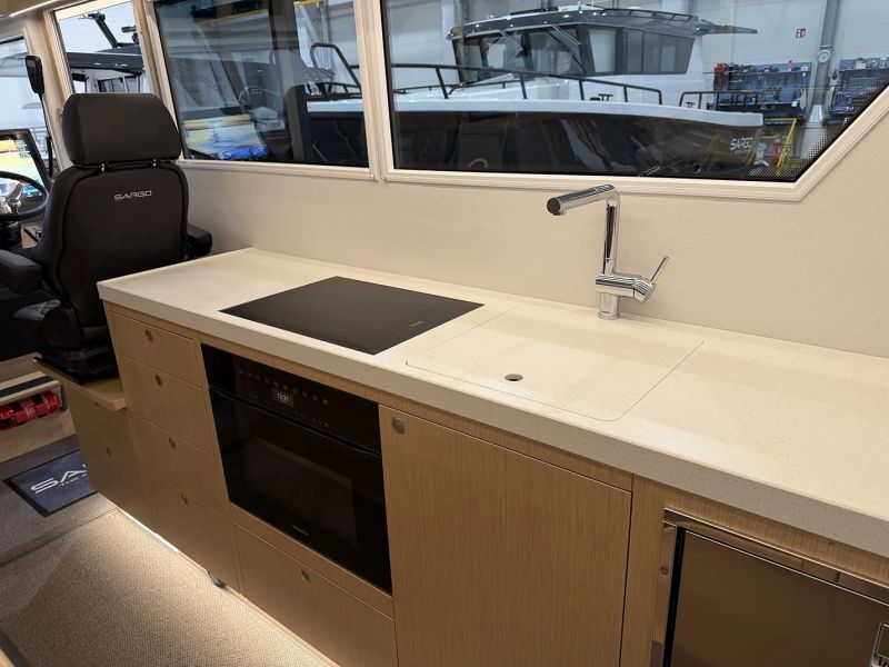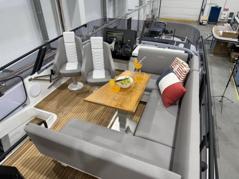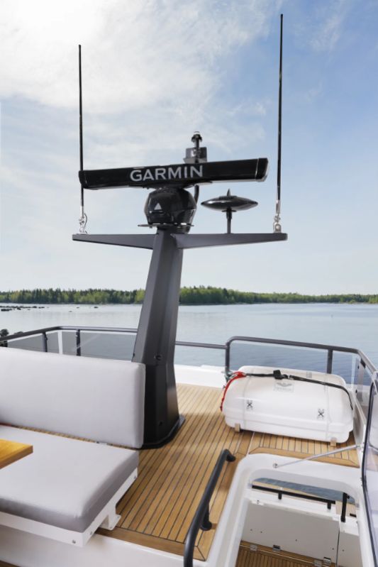 På flybridgen sitter kaptenen i centrum av en perfekt balanserad förarplats. Tre framåtvända passagerarstolar ger utmärkt sikt, och två av dem kan integreras med den U-formade soffan för att skapa en social matplats där upp till sju gäster kan njuta av en storslagen 360°-upplevelse i det fria. Standardutrustningen omfattar en 16” plotter, kylbox och diskho med varmt och kallt vatten, medan en ismaskin finns som tillval för extra lyx.