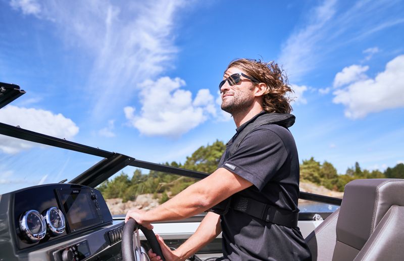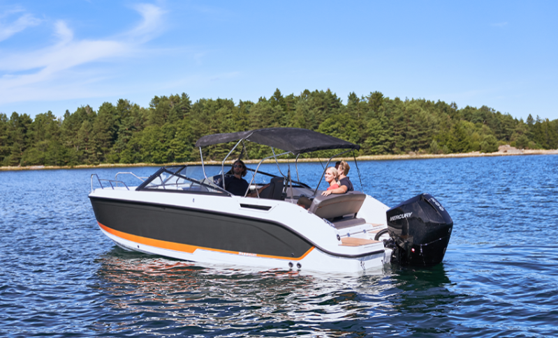 Säkerheten börjar vid instrumentbrädan. Här finns gott om plats för GPS/kartplotter, Mercury VesselView Link, Active Trim och Zipwake Dynamic Trim Control med mera. Denna utrustning hjälper dig att få ut det mesta av båten, samtidigt som du minskar bränsleförbrukningen. Mercury utombordare ger sportig och pålitlig körning från 115 upp till 225 hk. En djup sittbrunn och höga fribord i fören gör att både barn och vuxna kan sitta och röra sig tryggt i båten.