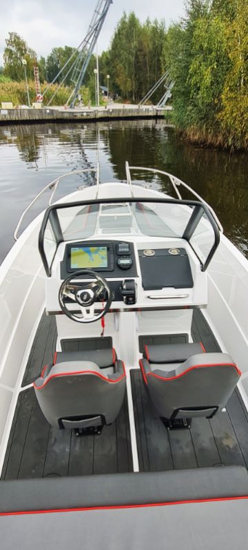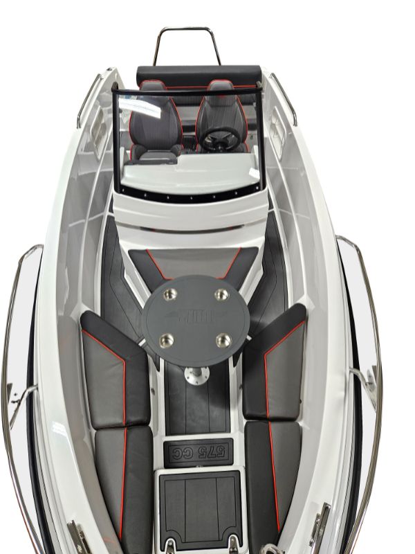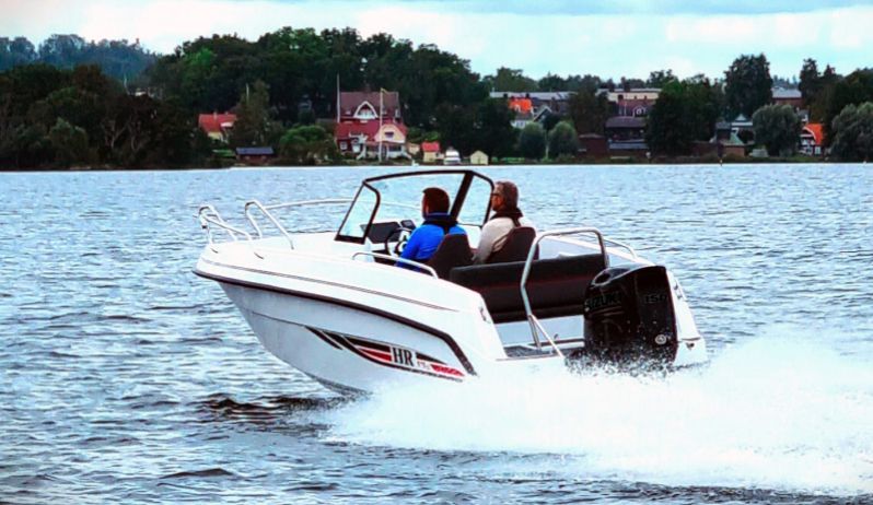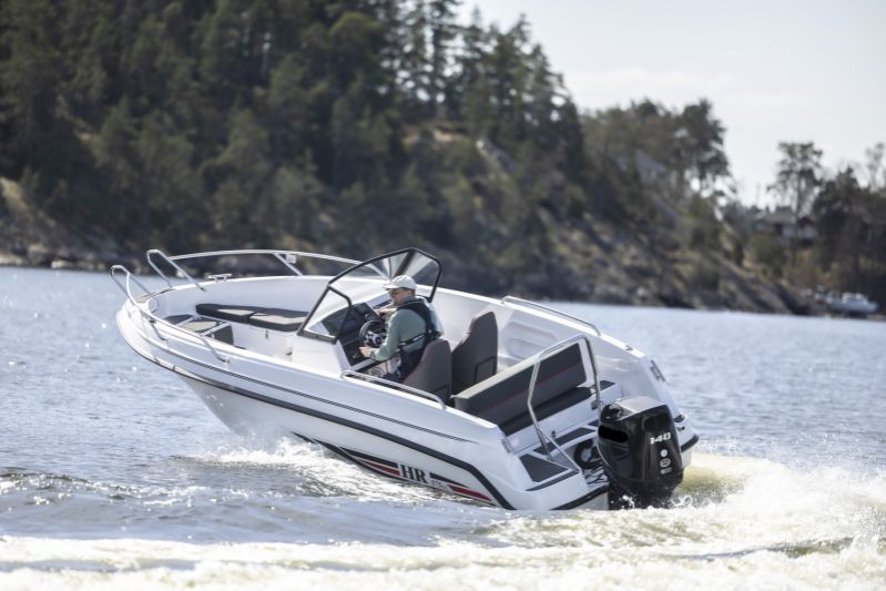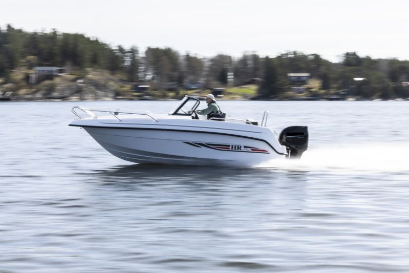 HR 575 CC är mycket påkostad med det mesta som standard ex. rejäl vattenskidbåge, komplett dynsats, exklusiva stolstativ med dämpning, hårdglasruta, hydraulstyrning från Baystar, sittbrunnsbord med drickahållare, pulpetöverdrag, stolsöverdrag samt en DAB stereo från Hertz Marine.