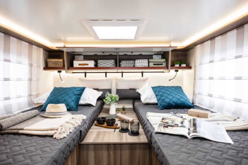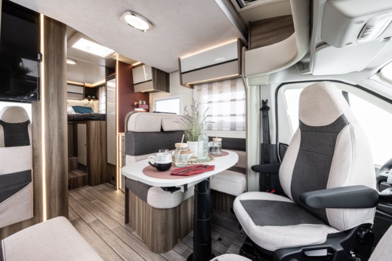 Ljus inredning med mörka detaljer skapar en härlig atmosfär i Roller Team Kronos. Oavsett vilken planlösning du väljer har du alltid gott om plats för hela familjen, 285 TL har upp till 5 sängplatser och lika många åkande. Längsgående låga sängar gör det enkelt att komma i säng, det går även att bädda hela den bakre bädden till en dubbelsäng.
